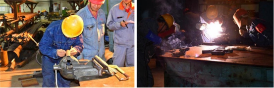 鏡頭二:檢修車間鉗工、焊工"小件制作"競賽現(xiàn)場,各參賽選手手繪設(shè)計草圖,運用精湛的技能,制作出精美的參賽作品。