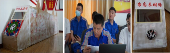 西柏坡精神是部生動的教科書,車間工人黨員袁有德利用平時裝配件的紙盒子,創(chuàng)意性地制做了一列"團結(jié)奮進號"火車,邀請黨員一起乘車前行。袁有德說:"團結(jié)奮進號"列車蘊含著學(xué)習(xí)西柏坡精神,強企富家、團結(jié)奮進的寓意,車頭前面的"大眾"標(biāo)識代表公司經(jīng)營的品牌;八個綠色的大美孚機油蓋代表八方來財,所有蓋口都向外代表招攬客戶,減少流失,而且像螺絲釘一樣牢牢釘?。≤囶^車尾標(biāo)有"勿忘來時路"的字樣,以此提醒廣大黨員干部不忘初心、牢記使命,一定不要忘記來時的路,回顧過去,展望未來,讓"團結(jié)奮進"號列車在西柏坡精神的感召下前行。支部要求,在疫情防控和汽車行車嚴竣的形勢下,我們每一個物產(chǎn)汽貿(mào)員工都是新時代的答卷者,讓"團結(jié)奮進號"奔馳在新時代的征程上,承載著中國夢、物產(chǎn)夢,承載著物產(chǎn)汽貿(mào)職工群眾對美好生活的向往,風(fēng)馳電掣,勇往直前,奔向未來!