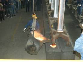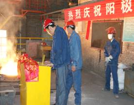 2012年7月7日上午11點(diǎn)零19分,青海物產(chǎn)工業(yè)投資有限公司10萬(wàn)噸電解鋁/年升級(jí)改造項(xiàng)目,簡(jiǎn)易陽(yáng)極組裝車(chē)間大門(mén)前鞭炮齊鳴。青海物產(chǎn)工業(yè)投資有限公司黨總支副書(shū)記、青海長(zhǎng)春炭素有限公司總經(jīng)理王松華,公司常務(wù)副總經(jīng)理、項(xiàng)目副總指揮常海寧,工業(yè)投資和長(zhǎng)春炭素公司副總經(jīng)理姜紅萍,公司副總經(jīng)理張秉瑜,總經(jīng)理助理范登福等公司領(lǐng)導(dǎo)和各車(chē)間、部室的職工出席了簡(jiǎn)單的點(diǎn)火澆鑄儀式。王松華同志按下了點(diǎn)火按鈕鄭重宣布澆鑄正式開(kāi)始。當(dāng)中頻爐工將第一爐鐵水倒入抬包時(shí),標(biāo)志著新陽(yáng)極組裝車(chē)間正式投產(chǎn)運(yùn)行。