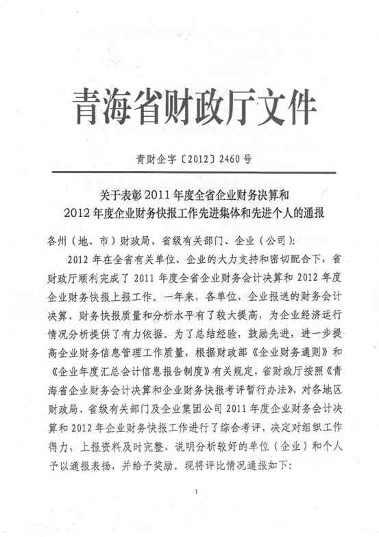 2012年,在集團(tuán)及所屬各公司領(lǐng)導(dǎo)的高度重視下,在所屬各公司的大力支持和密切配合下,在辛勤工作在財(cái)務(wù)會(huì)計(jì)崗位上的同事們的共同努力下,集團(tuán)總公司圓滿(mǎn)完成了省國(guó)資委和省財(cái)政廳各類(lèi)報(bào)表的上報(bào)工作,財(cái)務(wù)信息工作質(zhì)量、時(shí)效性和財(cái)務(wù)分析水平都比上一年度有所提高,受到了省國(guó)資委和省財(cái)政廳的好評(píng),集團(tuán)總公司2011年度財(cái)務(wù)決算工作被省國(guó)資委評(píng)為先進(jìn)單位,集團(tuán)財(cái)務(wù)審計(jì)部張莉青同志被省財(cái)政廳評(píng)為2012年度財(cái)務(wù)快報(bào)工作先進(jìn)個(gè)人。